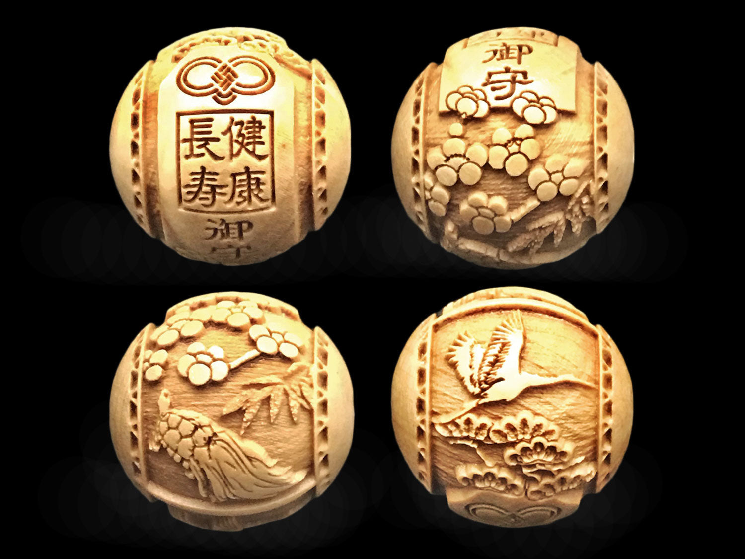 柘植に様々なお守り袋が刻印された、匠の逸品です。