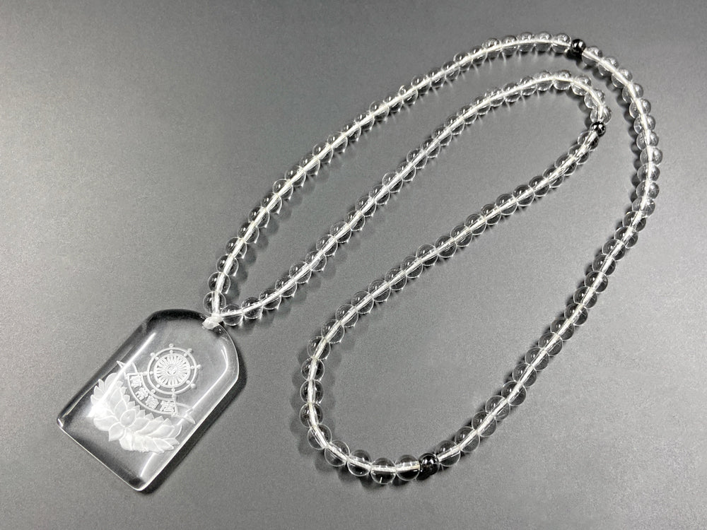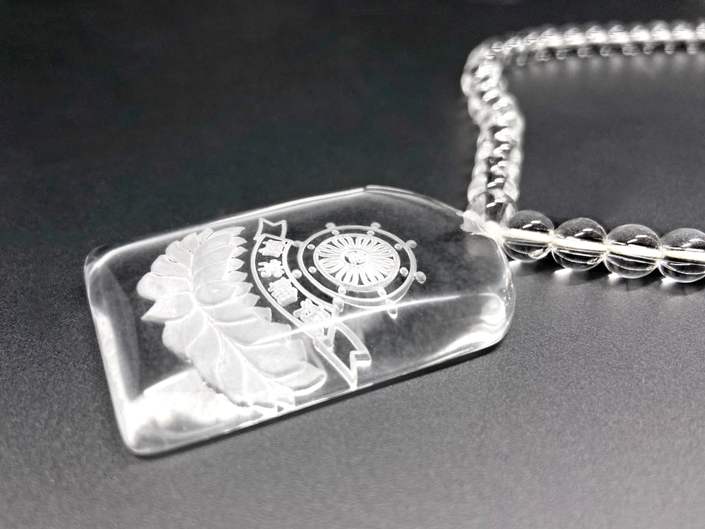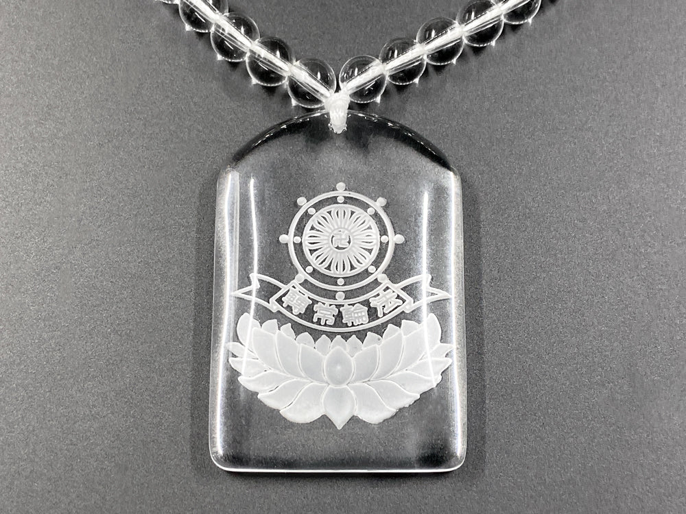 「轉常輪法」の文字と法輪が彫刻された水晶ペンダントです。